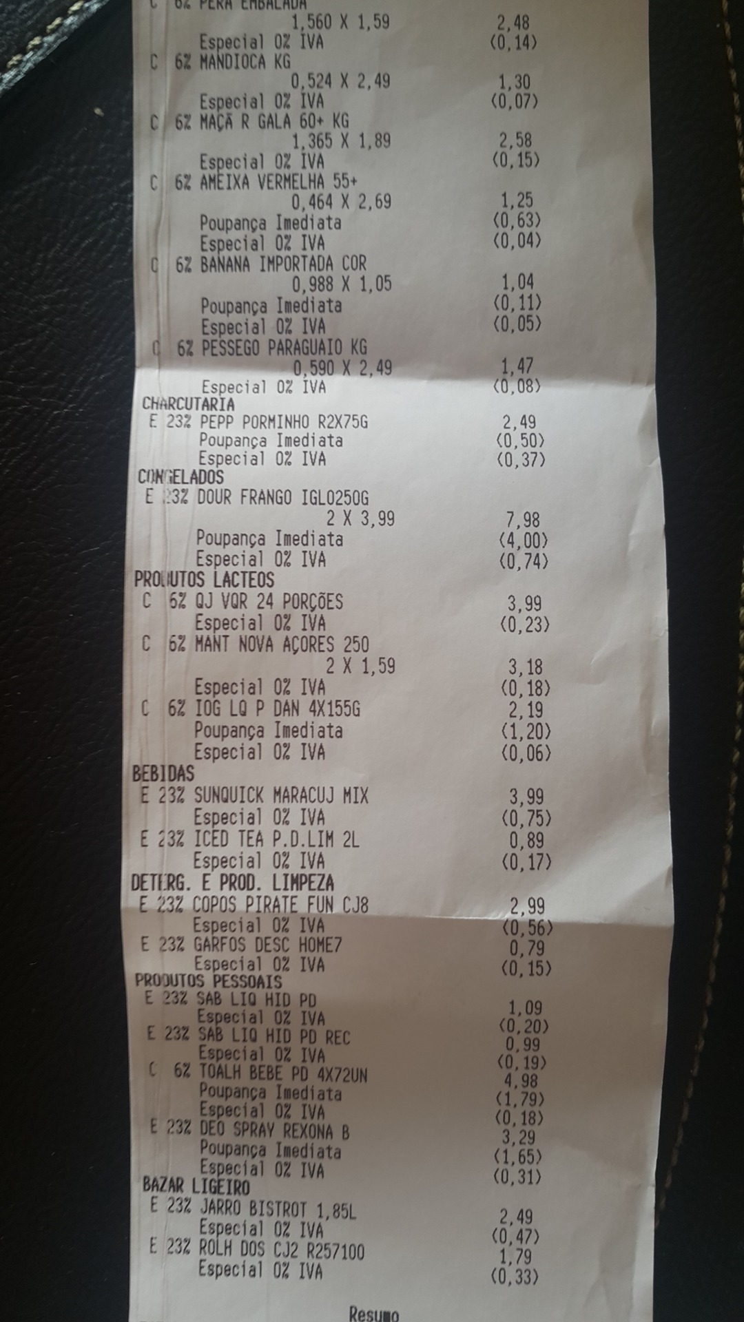 Eu iria pagar quase 90 euros pela compra. Mas economizei mais de 22 euros! Isso porque o supermercado estava com a campanha de IVA zero naquele fim de semana. IVA é o Imposto sobre Valor Acrescentado, o imposto geral sobre o consumo que incide sobre transmissões de bens, prestações de serviços, aquisições intracomunitárias e importações. É um imposto plurifásico, liquidado em todas as fases do circuito econômico, desde o produtor até o varejista (retalhista). Normalmente a taxa cobrada é de 23%, mas são aplicadas taxas reduzidas nos valores de 6% e 13% em alguns produtos, importações, prestações de serviços...