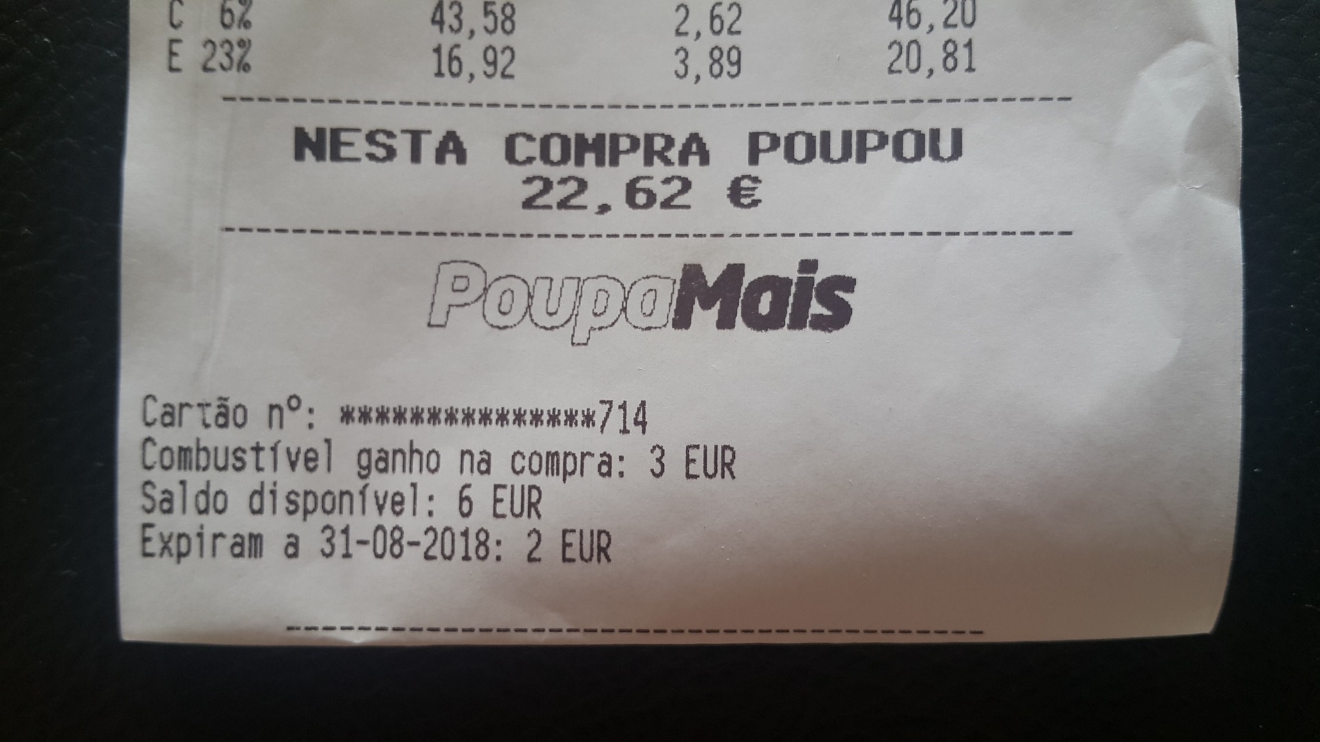 Eu fiquei muito feliz por realmente poupar dinheiro nessa compra! Quem não? E, como em vários supermercados daqui, esse oferece um cartão fidelidade que deve ser apresentado no caixa. Assim você acumula pontos, por exemplo, para trocar por combustível. Em outra rede você acumula euros e até ganha desconto de 10% que, numa próxima compra, pode abater do total. E ainda, ao abastecer seu carro e mostrar o cartão do supermercado, o valor se reverte em desconto no pagamento.